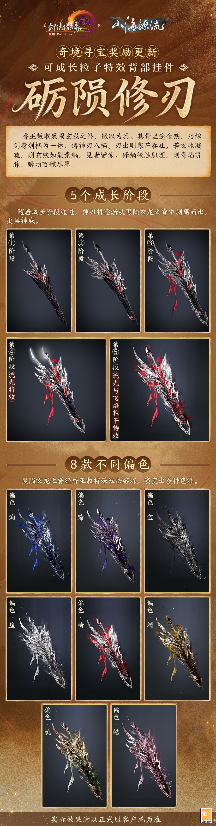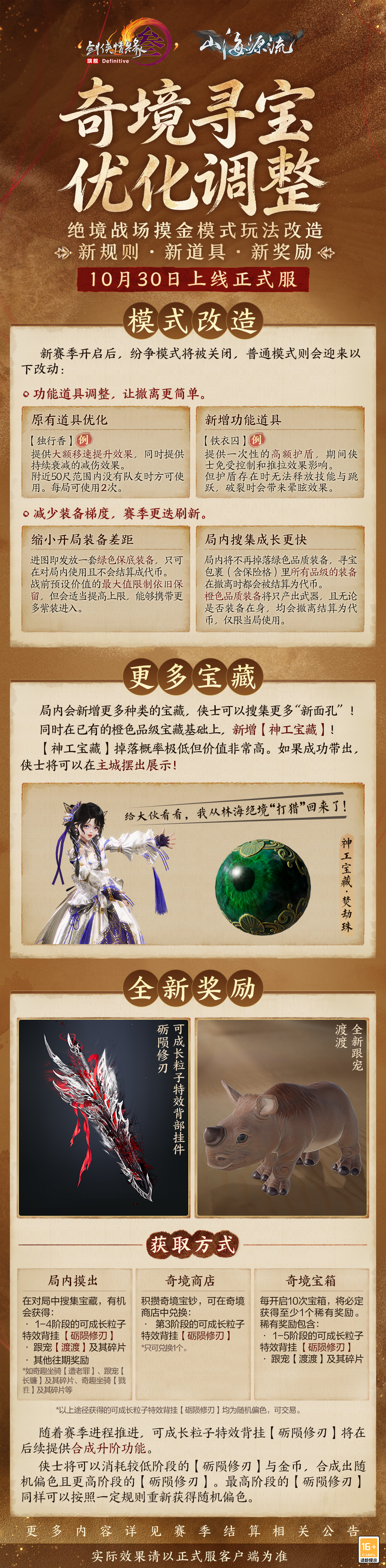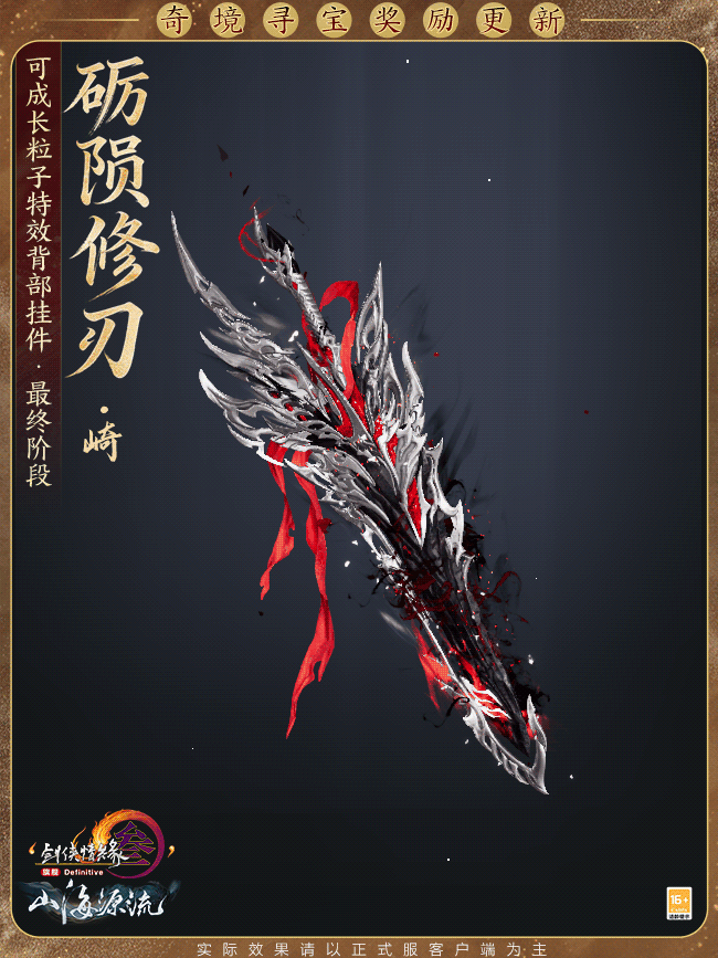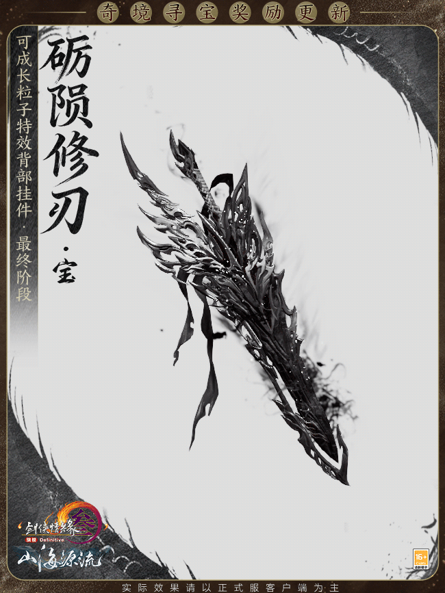 绝境探奇金,险途觅宝藏,《剑网3》新资料片“山海源流”公测定档10月30日,绝境战场摸金模式玩法改造将同步上线。威风凛凛的可成长粒子特效背部挂件等全新奖励今日爆料,一起来看看吧! 奇境寻宝奖励更新 新赛季中,侠士参与绝境战场摸金模式玩法“奇境寻宝”,将有机会获得可成长粒子特效背部挂件“砺陨修刃”和全新跟宠“渡渡”!“砺陨修刃”取黑陨玄龙之脊,锻以为兵,光焰跃然,银白棱脊错叠,观之森然肃杀,锋刃出鞘似能斩断幽冥! 不仅如此,可成长粒子特效背部挂件“砺陨修刃”还将根据自己的不同阶段有不同的表现,刀刃逐渐剥离而出,偏色各异更显神秘莫测! 奇境寻宝玩法调整 绝境战场摸金模式玩法“奇境寻宝”随赛季更迭,新赛季开启后,普通模式将迎来一轮调整改造。 一方面,新功能道具和装备规则调整即将亮相,旨在缩小对局内的初始差距,助力侠士能够顺利撤离,逃出生天!另一方面,奇境寻宝在丰富侠士的探索目标的同时,新增“神工宝藏”,侠士若成功将其带出,则可在主城摆出展示,和亲友们分享你的绝境探险成果!更多精彩,亟待侠士亲自探索! [编辑:月光下完美]