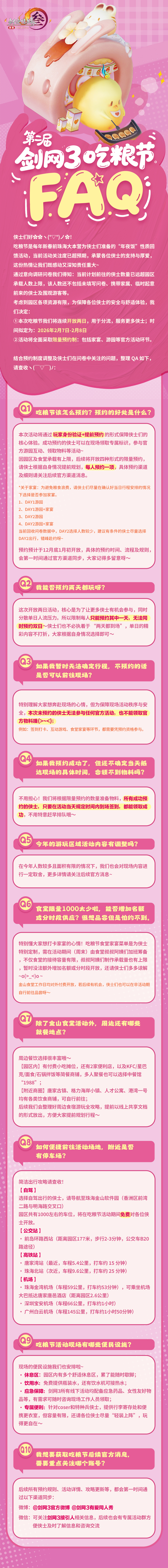 星涡暗涌旋古梦,灵韵初开孕天章,《剑网3》全新精英NPC套装与全新特效世界称号等新品现已上线,还有第二届吃粮节相关疑问解答为君奉上,诸多精彩内容,邀你一览为快! 全新精英NPC套装“绘影清光” 风逐苍穹行影去,执剑行遍万壑川,《剑网3》全新精英NPC套装“绘影清光”尽显旷达倜傥之态! 男款套装为空城殿首领·池清川同款。皮革束带修饰,更衬挺拔身姿,乌金扣环质感沉凝,腰系朱绦,赤绸飘曳,自生武者磊落风骨。女款套装为戮夜游六异侍·风行影同款。红黑相间的劲装版型尽彰利落,衣身的不规则剪裁展露随性,双臂佩戴金饰臂环映衬神秘格调。 全新精英NPC套装“绘影清光”将于11月20日7:00至12月18日7:00以最优价限时上架游戏商城及网页商城,但不会绝版,将在后续统一返场。 其中,成衣外装折后价为6,400通宝,发型挑染白折后价为6,320通宝,发型挑染红折后价为10,320通宝,均为不可交易款。上架期间购买均可享6倍积分回馈,可获得积分数详见商品/道具内容提示。 全新特效世界称号“灵韵” 太虚混沌卷苍茫,万古尘埃浮玉光。全新特效世界称号“灵韵”流光逐罡气萦回聚作涡旋,星云转圜间,苍天渺渺之浩瀚,倏而显观。 分为可交易款与不可交易款,新品限时直降,现售价15,000通宝,不可使用折扣券。上架期间购买均可享6倍积分回馈,可获得积分数详见商品/道具内容提示。 可交易 游戏内商城:11月20日20:05限量上架2,000份 网页版商城:11月20日20:05限量上架200份。 不可交易 游戏内及网页版商城:11月20日20:07至12月18日7:00限时上架。 吃粮节活动FAQ 剑网3吃粮节作为新春前夕珠海大本营为广大侠士筹备的“年夜饭”性质回馈活动,当前活动关注度已超预期。承蒙侠士们的支持与厚爱,这份热情让我们既感动又深知责任重大! 通过此前发布的意向调研问卷,我们得知当前计划前往的侠士数量已远超园区承载人数上限。考虑到园区各项资源有限,为充分保障各位侠士的安全与舒适体验,我们决定对本次吃粮节的活动安排进行调整: 吃粮节时间拟定为2026年2月7日至2月8日,将连续开放两日以分流服务更多侠士; 此外,包括家宴、游园在内的官方活动环节将全面采取限量预约制。 针对本次预约制度调整,以及侠士们在调研问卷中集中关注的各类问题,我们已整理QA进行解答,具体内容请见下图。后续更多活动详情,我们将第一时间通过官方渠道同步,敬请侠士关注。 [编辑:月光下完美]