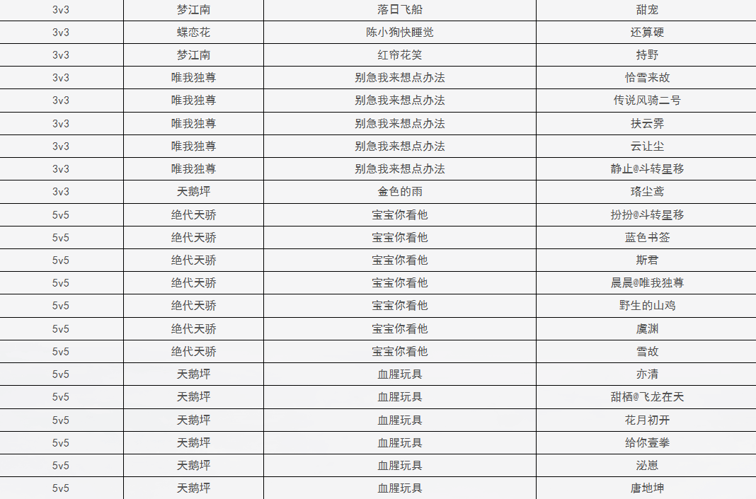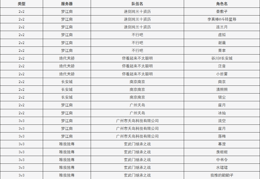 尊敬的侠士: 《剑网3》“太极秘录”赛季名剑大会赛季结算的称号及挂件奖励,将在12月8日维护后根据赛季排名进行奖励发放。 为保证名剑大会的公平性,我们已对参与了名剑大会的角色进行代打检测,符合下述条件的角色将无法获得称号及挂件奖励: · 在“太极秘录”赛季,被添加过禁令效果的账号,且在“太极秘录”赛季最后30天,名剑大会胜利场次大于等于25场、胜利场次使用非常用机器比例大于80%的角色。 · 在“太极秘录”赛季,名剑大会中有“送分”,“刷分”行为的队伍。 · 在“太极秘录”赛季,因在PVP玩法中使用过外挂而被处罚的角色。 经数据核查,本次取消奖励的违规角色名单如下(仅公布队伍排名前200有获奖资格的违规角色): [编辑:月光下完美]