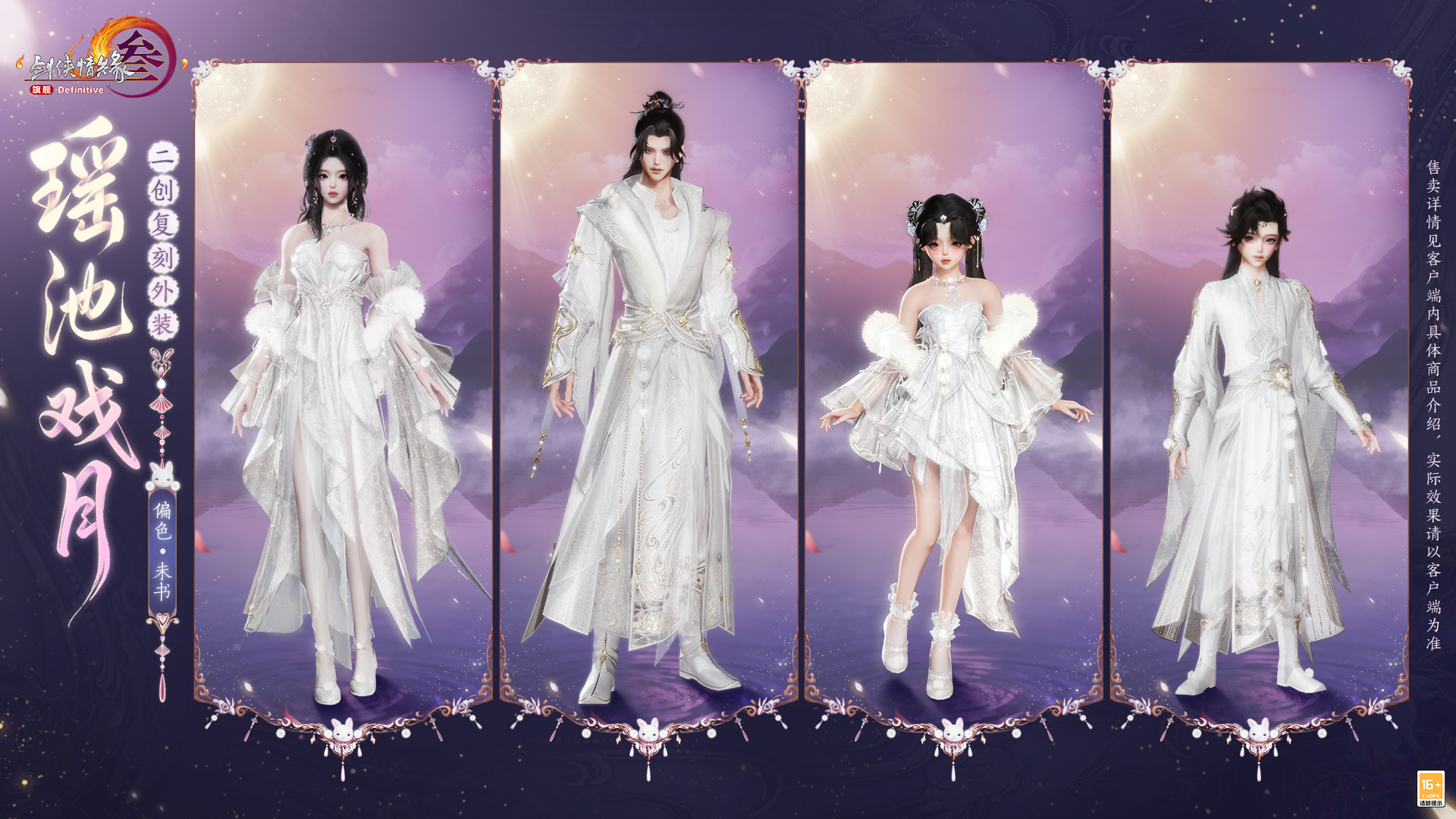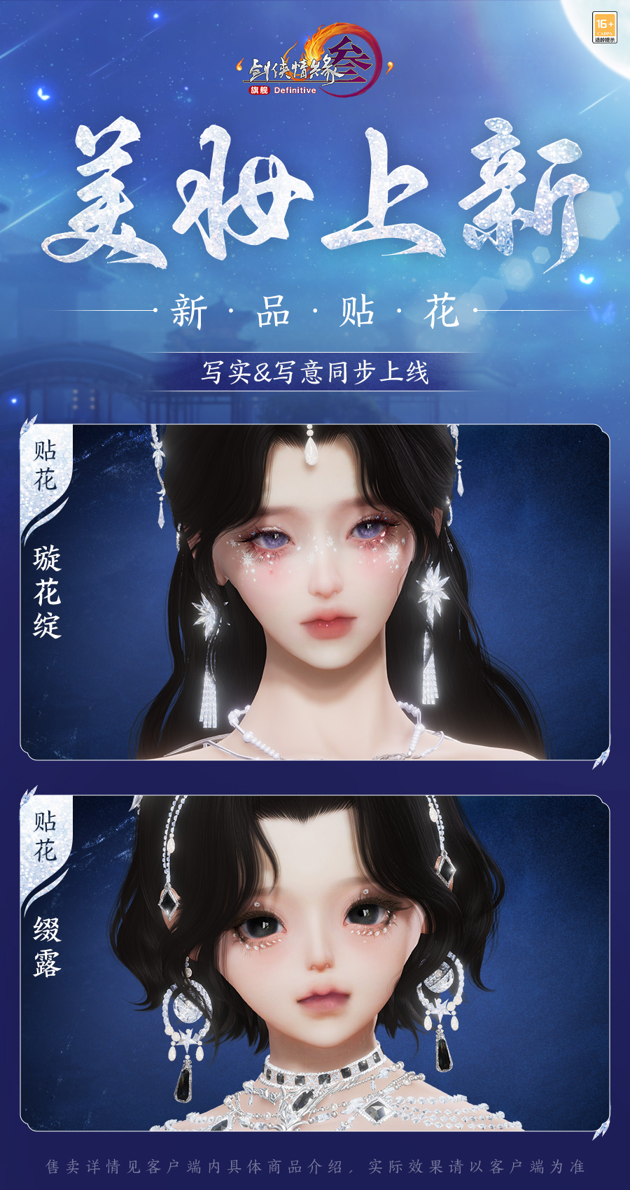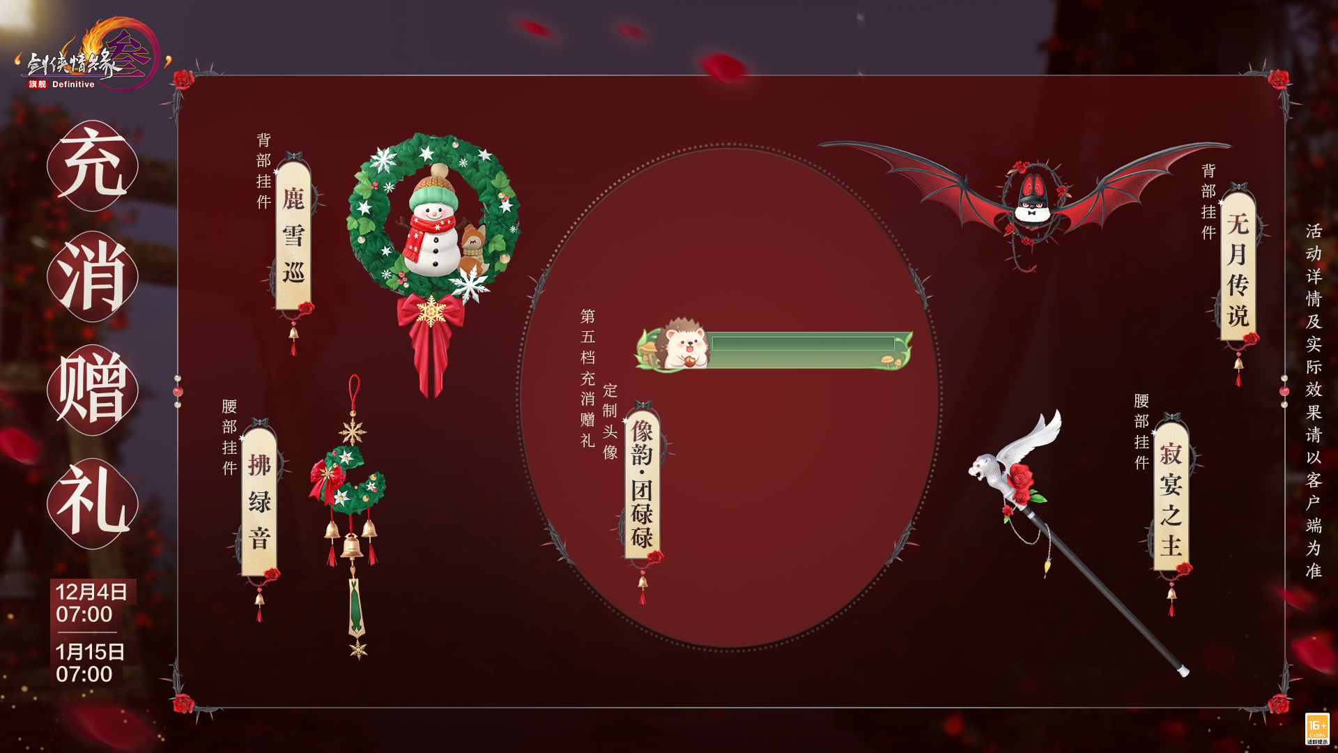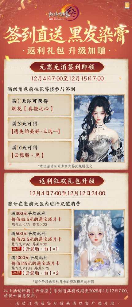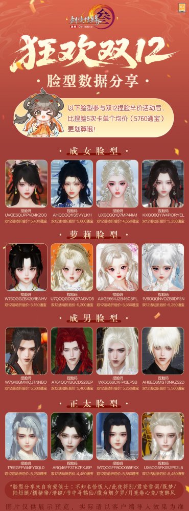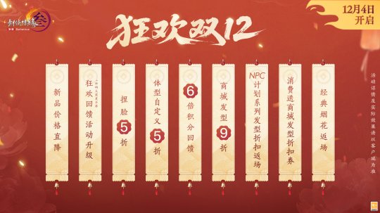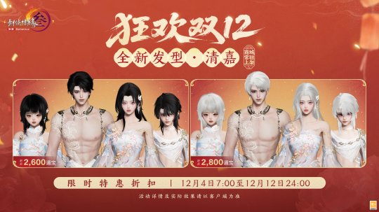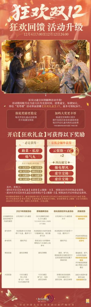 袂染幽香,衣裁云锦,《剑网3》狂欢双12系列新品现已上线,缤纷特惠活动火热进行中!诸多精彩内容,邀你一起来看!? 狂欢双12系列特惠活动 狂欢双12盛典重磅来袭,超多特惠活动12月4日开启!其中,通宝回馈活动同步升级,活动期间充消每满50元即可获赠【狂欢礼盒】!全新【狂欢礼盒】基于此前回馈活动进行优化: 拥有更稳定的保底奖励,每次开启礼盒必定获得至少3元的通宝或月卡奖励,平均可获得返利价值量整体提升! 拥有更丰厚的加码奖励,额外加码白发染发道具奖励,每次开启礼盒均有机会获得,同时设有保底机制! 开启时间更自由,不再受奖池注入时间影响,侠士可自由安排活动参与时间! 返利升级,奖励加赠!为答谢广大侠士的理解与支持,活动期间,满级侠士前往花萼楼参与签到活动,满7天即可免费领取黑色染发道具! 诸多精彩惊喜连连,写实、写意捏脸与体型自定义五折优惠将开启,随心打造你的百变江湖造型! 双12系列新品价格直降,同时乐享6倍积分回馈和发型9折优惠,还有消费满赠8折发型优惠券一齐助力,折扣券可与双12发型9折活动叠加!与此同时,经典烟花和全新名片装饰为你带来更多意趣,不容错过! 太多好看捏脸数据挑花眼?又担心没有捏脸卡一口价买贵了?此处为侠士们精选了一波物美价廉的漂亮脸型,走过路过别错过! 此外还有全新商城写意与写实妆容贴花精致上新!“缀露”似碎玉清泠,眸映微光;“璇花绽”则若繁星萦空,闪耀璀璨。 狂欢双12系列新品上线 魔镜主题外装礼盒“墨海星纱” 墨池洗镜分鳞碎,星河连天云霄倾,双12新品魔镜主题外装礼盒“墨海星纱”沉色如夜凝深潭,凝萃复古神秘之韵,多重材质层叠交错,将华贵宝石的璀璨效果完美呈现!星辉铺陈浩瀚寰宇,动静之间愈加光彩熠熠,更显雍容格调。 外装特效开启时,魔镜自虚空中骤然显现,刹那间星尘漫卷苍穹,晶石拔节丛生,交织迷离幻境。星辰凝做镜中之影,真实与幻象恍惚难辨。 礼盒内含特效背部挂件“浮生鉴”?,使用特效后星屑离轨闪烁,镜碎四散,平野骤然生光,千般变幻凝于方寸,持镜凌空俯瞰,观浮生万象。 礼盒包含基于 Body3.0模型和新布料设计的特效动作成衣+定制白发+特效背部挂件“浮生鉴”+ 附赠定制黑发。 参与双12限时直降活动,现售价49,000通宝,不可使用折扣券。 · 可交易 游戏内商城:12月4日20:05限量上架4,000份。 网页版商城:12月4日20:05限量上架400份。 · 不可交易 游戏内商城及网页版商城:12月4日20:13至1月5日7:00限时上架。 二创复刻外装“瑶池戏月” 仙池漾碎银蟾影,玉露沾衣伴月游,二创复刻外装暗纹隐现含雅致,玉兔嬉莲沿衣摆精致绣就,趣致景象鲜活入目。另有清蕤藏馥,暗香袅袅逐风而动,几簇绒毛点缀恰如轻雪覆云裳。 共有4款偏色可供选购,参与双12限时直降活动,现售价17,000通宝,不可使用折扣券。 · 可交易(四选一礼盒) 游戏内商城:12月4日20:09限量上架4,000份。 网页版商城:12月4日20:09限量上架400份。 · 不可交易 游戏内商城及网页版商城:12月4日20:13至1月5日7:00限时上架。 全新特惠发型 墨丝轻绾随云势,风拂梢头见雅容。全新特惠发型“清嘉”未点繁妆也胜雅,发丝轻扬可观自在从容,得见侠者气度天成。 全新发型“清嘉”将常驻上架商城,活动期间限时享特惠折扣,黑发折后2,600通宝,白发折后2,800通宝,【晨沾露】、【理墨云】等往期特惠发型同享限时折扣。购买特惠发型还有礼包与外装拓印5折折扣券等精彩好礼相赠! 粒子特效披风"流光仙岚" 仙姝引我踏云行,岱舆流霞不夜天,全新粒子特效披风“?流光仙岚”参与狂欢双12限时直降活动,现售价48,800通宝! 轻纱披曳如雾,质若月华裁就。朱红珊瑚缀以莹白珍珠,聚江海浩瀚之清魄,撷一缕清润流岚,凝萃山间远黛,金芒流转其上,恰如朝露凝于琼枝玉叶,珠翠交辉。特效开启时,金阁琼楼耀金辉,流光启处云雾腾,八仙踏浪登场,云光灼灼更显戏曲风华,教人疑入仙家戏台。 参与双12限时直降活动,现售价48,800通宝,不可使用折扣券。 · 可交易 游戏内商城:12月4日20:07限量上架2,000份。 网页版商城:12月4日20:07限量上架200份。 · 不可交易 游戏内商城及网页版商城:12月4日20:13至1月5日7:00限时上架。 两款全新眼饰 青蔓衔珠凝吉色,琼枝缀彩焕祥辉,两款全新眼饰各有风采! “银蔓悬珠”玉蕊含露凝珠,蔓叶舒展,赤珠错落点缀如枝头丰美果实,更添吉祥如意;“?启明”暗红镜片轻掩双眼如炬神采,似勘破红尘者大隐于市,尽显神秘莫测气质。 参与双12限时直降活动,折后售价12,000通宝,不可使用折扣券。 · 可交易(2选1礼盒) 游戏内商城:12月4日20:11限量上架2,000份 网页版商城:12月4日20:11限量上架200份 · 不可交易 游戏内商城及网页版商城:12月4日20:13至1月5日7:00限时上架。 新一期充消赠礼 山鹿闲栖青松下,玉客含笑守经年,新一期充消赠礼现已亮相!其中,第五档充消赠礼定制头像【?像韵·团碌碌】灵巧可爱,似将森林中的自然美好绘入一方小天地,萌趣治愈。 充消活动时间:12月4日7:00至1月15日7:00 满60元/180元:可获取腰部挂件【寂宴之主】或【拂绿音】二选一 满120元/240元:可获得背部挂件【无月传说】或【鹿雪巡】二选一 满300元:可领取定制头像【?像韵·团碌碌】及以上所有物品 [编辑:月光下完美]