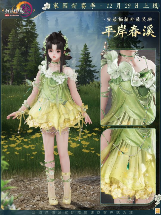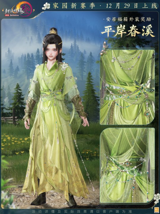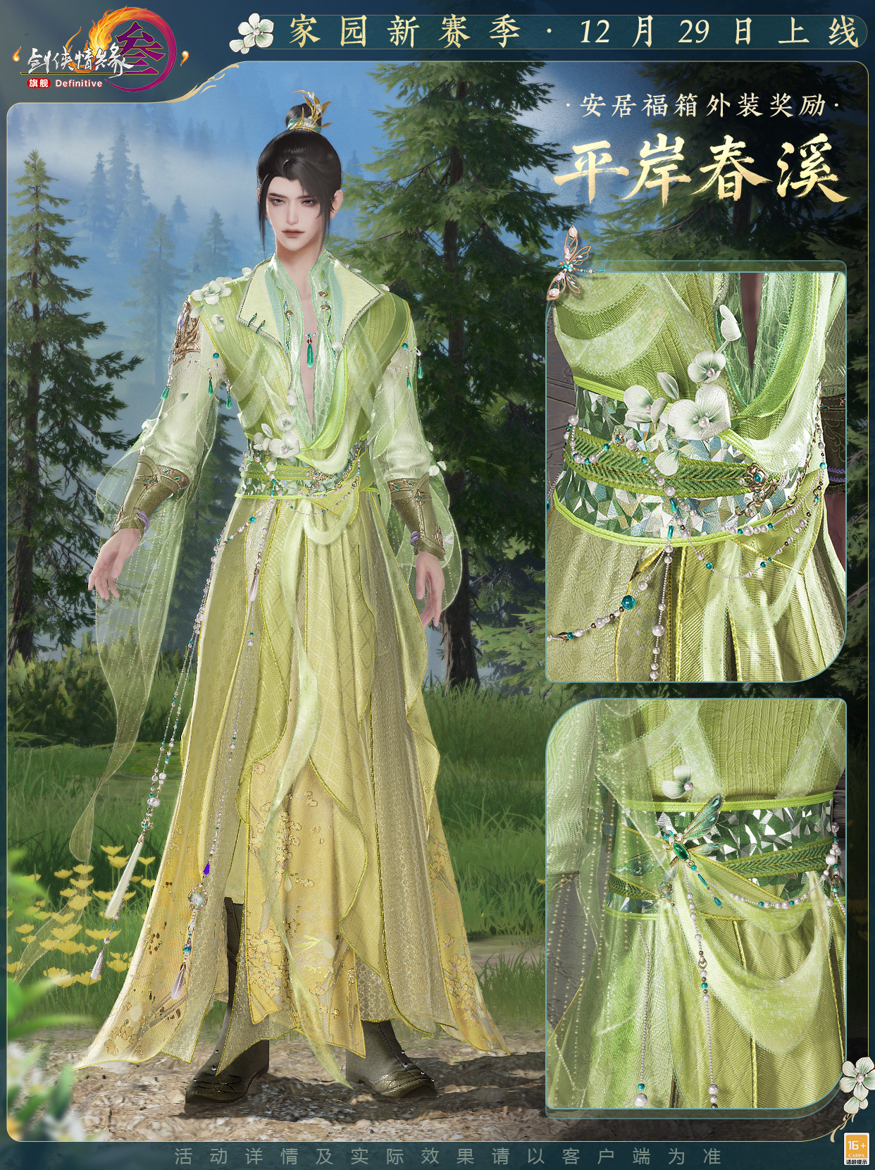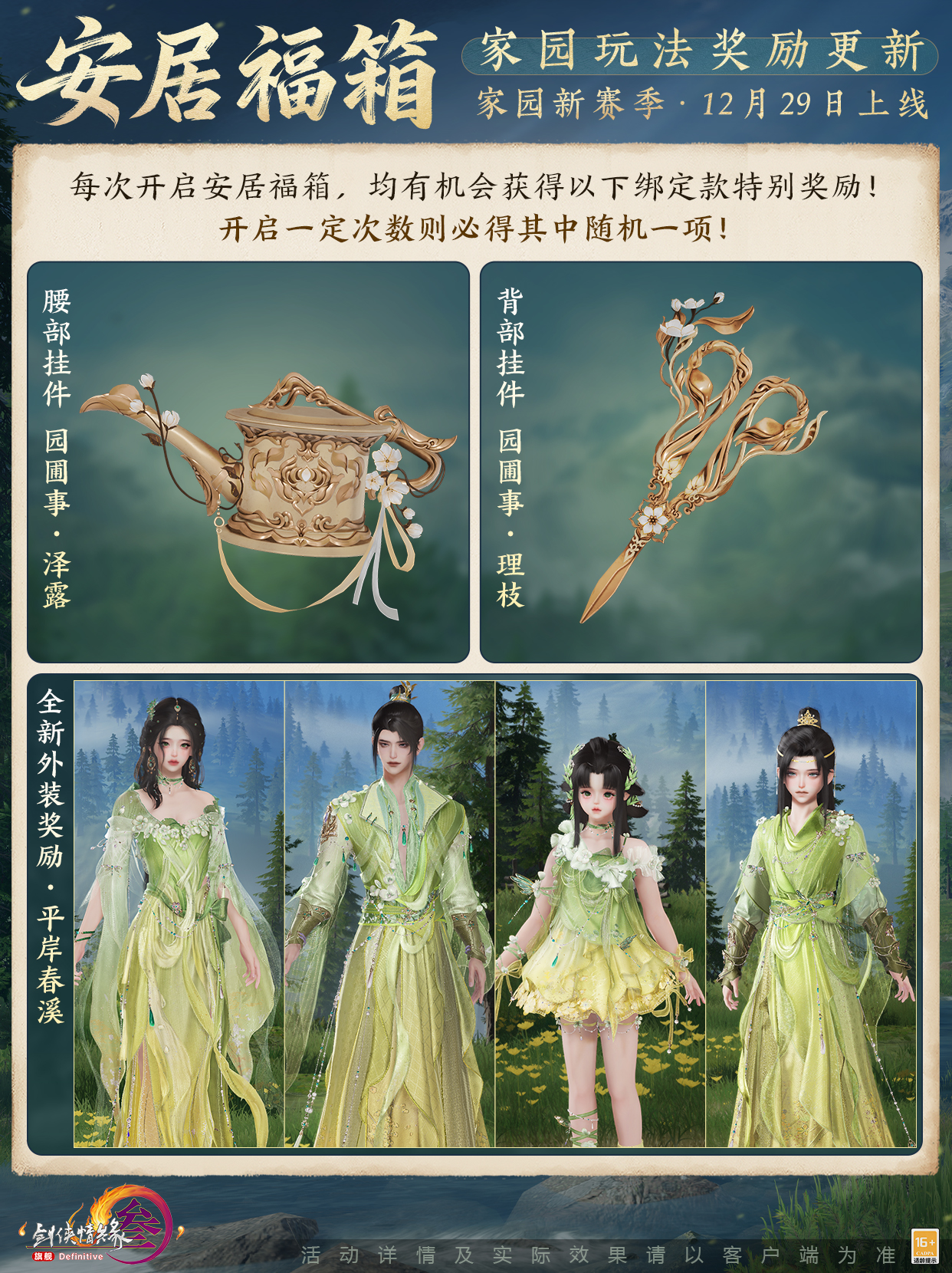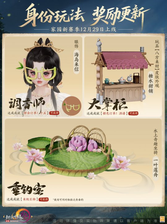 暖冬新岁,结庐江湖,《剑网3》家园新赛季12月29日上线!悠然生活全新启幕,诸多精彩内容为君献上! 安居福箱奖励更新 福箱盈怀纳吉光,清居四季沐安康,安居福箱全新奖励现已登场!其中,全新外装奖励“平岸春溪”隐芳含幽,衣间藏翠盈春色满怀,绿意染袂似新叶拂风蜻蜓翩翩,停驻满目暖晴。 家园新赛季开启后,侠士每次开启安居福箱均有机会获得其中随机一项绑定款特殊奖励!【园圃事·泽露】壶身攀衍繁花蔓叶,【园圃事·理枝】裁得半帘芳意,凝萃家园惬意时光。 身份玩法奖励更新 家园身份玩法再添惊喜,侠士通过身份玩法达成对应成就,即可获得诸多精彩奖励! 水上奇趣坐骑【一叶莲舟】翠叶载身凌波而行,露凝莲香,更染一襟清逸;眼饰【海岛来信】俏皮可爱,满怀意趣!甜蜜蜜的不只有甜品主题武器,大掌柜的居家家具【糖水甜铺】走过路过别错过! 家园赛季展望奖励更新 晓雾暮云,辰光辗转,将家园的美好藏进每一次耕耘。素英摇影碧痕柔,闲庭风轻意自悠,侠士达成家园新赛季展望目标后,即可获得手饰【点点晴·右】、头饰【桔星高照】及更多精彩奖励! [编辑:月光下完美]