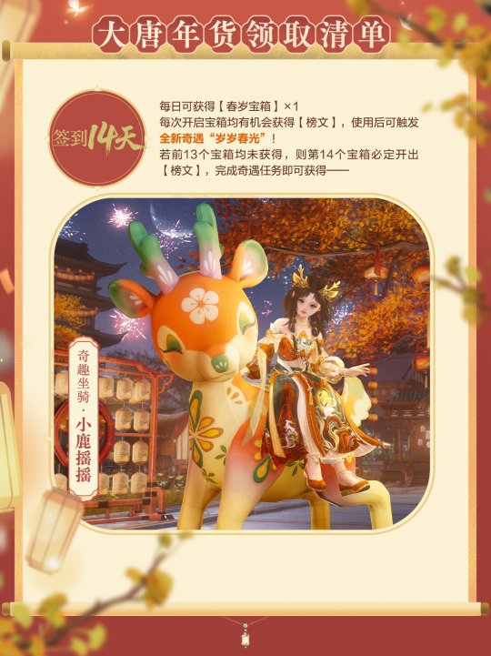 千门纳彩迎祥瑞,春风入户纳新福,《剑网3》马年新春版本“四海同歌”2月5日上线,签到活动奖励今日亮相,让我们骑上小鹿摇摇车,一起体验大唐年味! 准备领取大唐“年货”啦!你就是最棒的侠士,全新表情动作将满溢的赞美传遍整个江湖!新年就该快意畅游,繁忙琐事我们“不讲不讲”,全新站姿动作伴你开开心心度佳节! 对于小朋友来说有点幼稚,但对成熟的大侠来说刚刚好!新春奇遇“岁岁春光”全民可得,奖励采用花灯元素打造小鹿摇摇车,在这阖家团圆之际,大侠不妨卸下一身繁重,沉浸感受节日的喜庆与欢乐吧! [编辑:月光下完美]