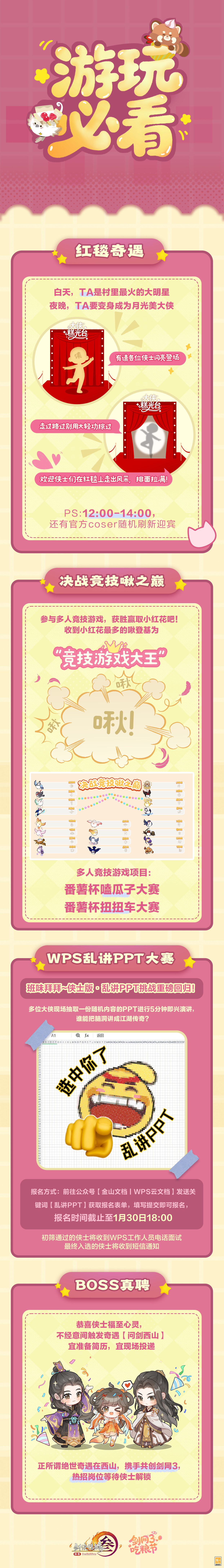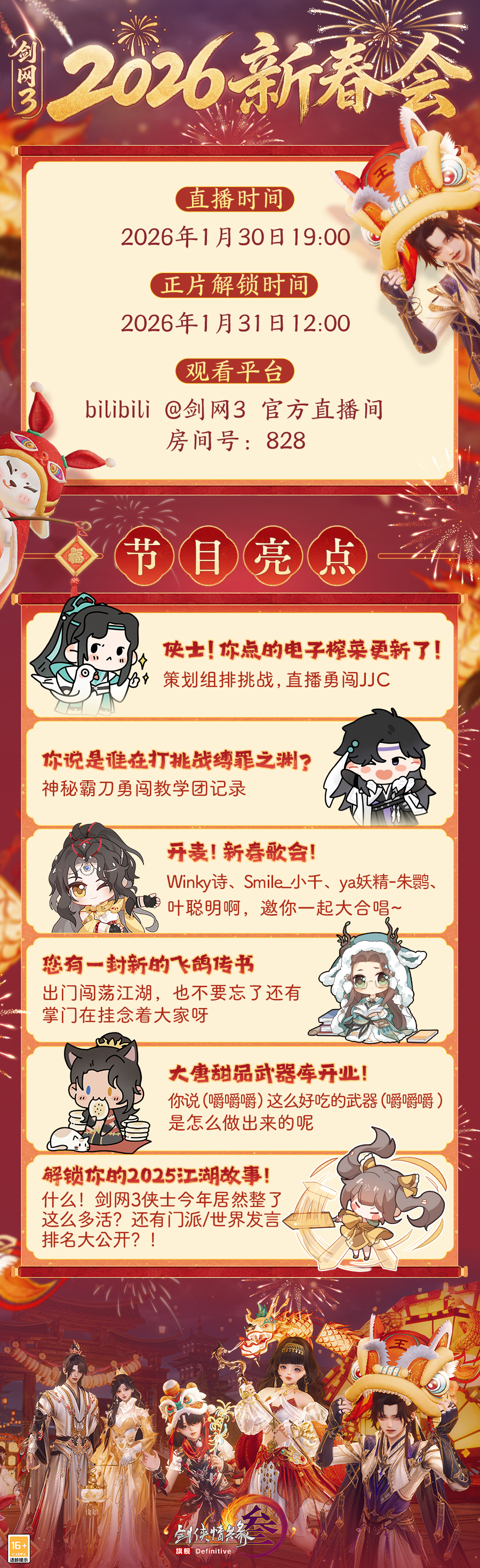 喜迎新春,江湖同欢!《剑网3》邀侠士共迎佳节,线上新春会精彩不停,线下吃粮节游园会趣味全开,一同解锁更多年味与惊喜! 2026线上新春会直播 欢乐不断,好戏连台!今晚19:00锁定Bilibili剑网3官方直播间,一起收看剑网3番薯自己的新春会! 神秘朋友将带来喜闻乐见的电子榨菜环节,新春歌会唱响熟悉的经典旋律,还有掌门寄来新春家书,暖心关怀随信而至……更多精彩内容,相约《剑网3》2026新春会! 第二届吃粮节线下游园活动 开开心心,线下吃粮!《剑网3》第二届吃粮节线下游园活动将于2月7-8日开展,现场设置诸多区域——侠士可前往周边市集、趣味游戏区和美味小吃街纵享欢乐,也可前往“大侠糕光台”一展风采,邂逅随机门派coser!超全面指南今日奉上,带你玩转吃粮节! 边玩边拿,回家领点家里产的“鸡蛋”!参与预约即可领取限定纪念礼,打卡活动解锁更多惊喜掉落! 趣味活动接连不断,精彩环节轮番上演!除了草坪歌会、节目表演、PPT乱讲大赛,还有全门派coser集结与绚烂烟花奇遇,让大家看过瘾! 江湖路远,岁岁相伴,欢迎侠士回家吃饭!温馨家宴准备就绪,美味佳肴即刻呈上! 活动期间将同步开启线上直播,侠士可锁定各大平台官方直播间,一起沉浸云游!本次线下活动还会在推栏APP实时显示地图排队进程,方便侠士一览现场动态!联系接引人发送【吃粮节】,入群可获得最新活动资讯和小助手答疑。愿诸位侠士乘兴而来,尽兴而归! [编辑:月光下完美]