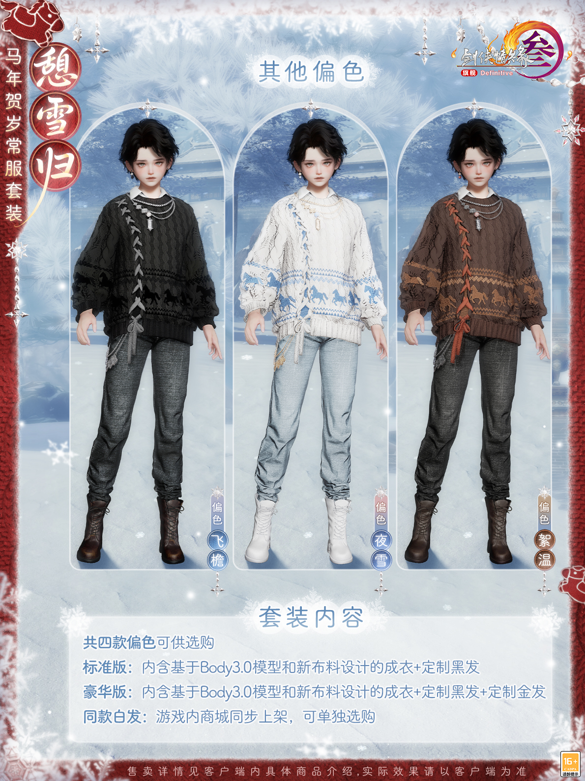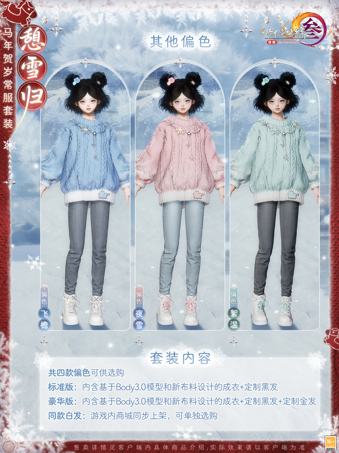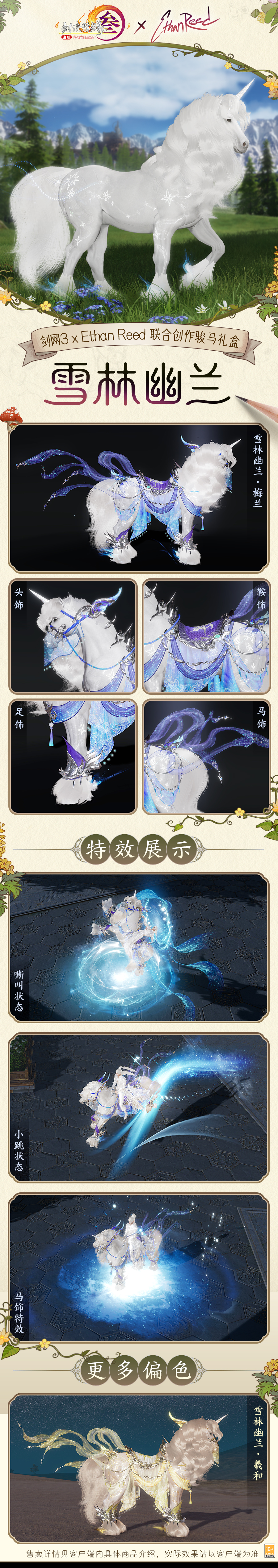 续写闪耀故事,守护纯真美好!《剑网3》马年新春版本“四海同歌”携春节贺岁系列外装2月5日上线,还有来自童话世界的伙伴将与你相伴江湖! 《剑网3》×Ethan Reed冒险童话小剧场 传说在弓月城外,有一处常年薄雾轻萦的山谷,其中藏着被古老歌谣代代传颂的翡翠幻境,而新的小马伙伴——“晨曦”的故事,就从这里开始。 穿越绮丽梦境,来自童话世界的朋友降临大唐!让我们与“晨曦”和神秘美丽独角兽“梅兰”相会,共度闪耀的美好时光。 发挥“可爱”的力量,见证童心的珍贵!本次我们邀请到了国际知名艺术家、毛绒绒亲爹——Ethan Reed,共同创作了这段奇幻的浪漫之旅!视频中不但有唯美的故事篇章,还有《剑网3》×Ethan Reed联合创作的萌趣挂宠“晨曦”与全新骏马礼盒“雪林幽兰”,以及马年贺岁常服套装“憩雪归”等新品展示,一起来看看吧! Ethan Reed与他的小马“晨曦” 以写意风韵勾勒梦幻的童话世界。心怀热爱,守护纯真,以笔为媒,编织美好!此番Ethan Reed将倾情分享联合创作的心路历程,与侠士一同见证活泼可爱的小马如何跃然笔下!小马“晨曦”踏光而来,赴马年新岁,愿诸位侠士新年顺颂时宜,百事从欢! 联合创作萌趣挂宠与骏马礼盒 当可爱降临大唐,江湖气韵与童心奇想便会碰撞出别样火花!《剑网3》×Ethan Reed联合创作萌趣挂宠可爱灵动,舒展的鬃毛是自由与热情的印证,宛若潜入梦境的使者,把满格可爱播撒江湖。更有多变表情带来无尽欢乐,嬉笑辗转间,一举一动尽显“晨曦”的俏皮本性。 狡黠灵动,活泼讨喜,小小的身型藏着无限的趣味!若与“晨曦”同游,俏皮小马将相伴侠士身侧,并解锁多种趣味互动,时而环身轻奏乐曲,时而撒娇尽显萌态,更如林间精灵般绕身翩飞,满溢亲昵,播撒名为爱与纯真的魔法! 纵使收获无数宝藏与荣耀,晨曦的内心始终留有一片柔软的空白——那里只属于梅兰。《剑网3》×Ethan Reed联合创作全新骏马礼盒“雪林幽兰”以独角兽“梅兰”为灵感,着意展现这位宛如画中降临的梦幻精灵,温柔而高贵。不涉尘嚣,自守灵衿。幽谷长在,风过梅音。 马年贺岁常服套装“憩雪归” 温情新岁,踏雪而归。马年贺岁常服套装“憩雪归”加持全新材质工艺,融入小马元素,增添俏皮妙思,还原真实毛线的肌理感,将蓬松软糯的质感与自然错落的纹理层次尽数呈现。 身着暖绒毛衣,轻裹一身温煦,邂逅冬日独有的温柔治愈。共有四款偏色可供选购,豪华版礼盒另含定制金发! [编辑:月光下完美]