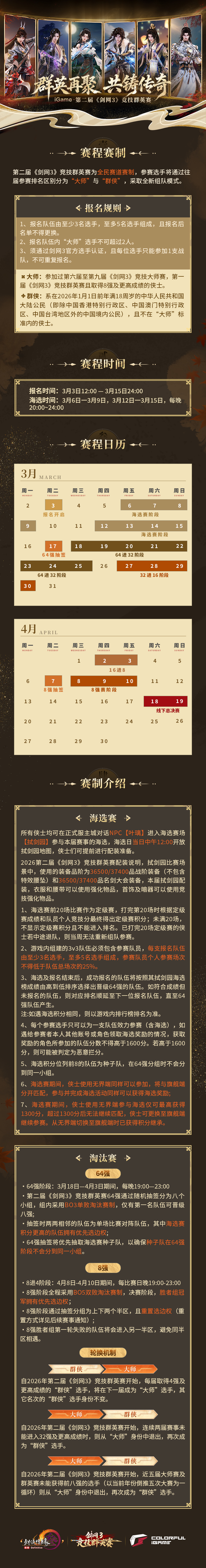 一剑江湖平风雨,千秋武林共逐鹿!第二届《剑网3》竞技群英赛报名今日正式开启,诚邀侠士共赴赛场,会逢天下豪杰,同书武林新章! 赛事规则 第二届《剑网3》竞技群英赛将继续沿用全民赛道赛制,面向所有侠士开放报名海选!延续“大师2人+群侠3人”的组队模式,无论是赛场名将还是新锐侠士,均可一展身手,迎战巅峰对决! 在队伍组建过程中,若队伍中的“大师”数量超过2位,将无法通过报名审核,但仍然可根据队伍海选情况获得海选奖励;对队伍中的新人数量则不做限制,侠士可组5名新人正常报名参赛。 为了优化各位侠士的参赛体验,本届赛事重新界定了“大师”选手相关规则,给侠士们提供更多组队空间。 自本届赛事开始,调整后的相关规则如下: “大师”选手: 参加过第六届至第九届竞技大师赛、第一届竞技群英赛,取得8强及更高成绩的侠士 “群侠”选手: 在2026年1月1日前年满18周岁的中国大陆公民,且不在“大师”标准内的侠士 群侠→大师: 每届取得4强及更高成绩的“群侠”选手,将在下一届成为“大师”选手,其它名次的“群侠”选手身份不变; 大师→群侠: 近五届大师赛及群英赛未能获得前8强的选手,则从“大师”身份中退出,再次成为“群侠”选手; 连续两届赛事未能进入32强及更高成绩的选手,则从“大师”身份中退出,再次成为“群侠”选手 赛事活动奖励 海选赛将于3月6日至15日指定时间段内开启,侠士们可前往各大主城与 NPC【叶璃】对话,或通过赛事活动界面点击【前往比赛】,进入海选赛场【拭剑园】一展身手。 侠士完成指定场次挑战并达到对应积分,即可解锁赛事丰厚专属奖励!雅致柔美的家具“照夜行”灯笼在光影轻漾间点亮一室诗意,还有专属后缀称号“传奇”尽显英雄豪情。 海选期间,“凌云梯”“旧宴承欢”“孤沙影寂” 三大奇遇触发概率将限时提升,在后续赛程中还将开启胜负竞猜环节,参与即可兑换更多丰厚奖励,邀侠士与队友同赴赛场,并肩逐鹿,满载荣勋而归! 赛制详情 报名开启期间,侠士可通过第二届《剑网3》竞技群英赛专题页完成选手认证与队伍报名。所有侠士均可参与海选赛并领取对应奖励,但64强晋级资格将仅根据已成功报名队伍的海选排名进行判定。 为持续提升侠士们的参赛体验,本届赛事将于64强淘汰赛阶段起,正式启用全新剑网3赛事BP系统,具体使用说明及规范将于后续进行介绍,敬请期待! [编辑:月光下完美]
