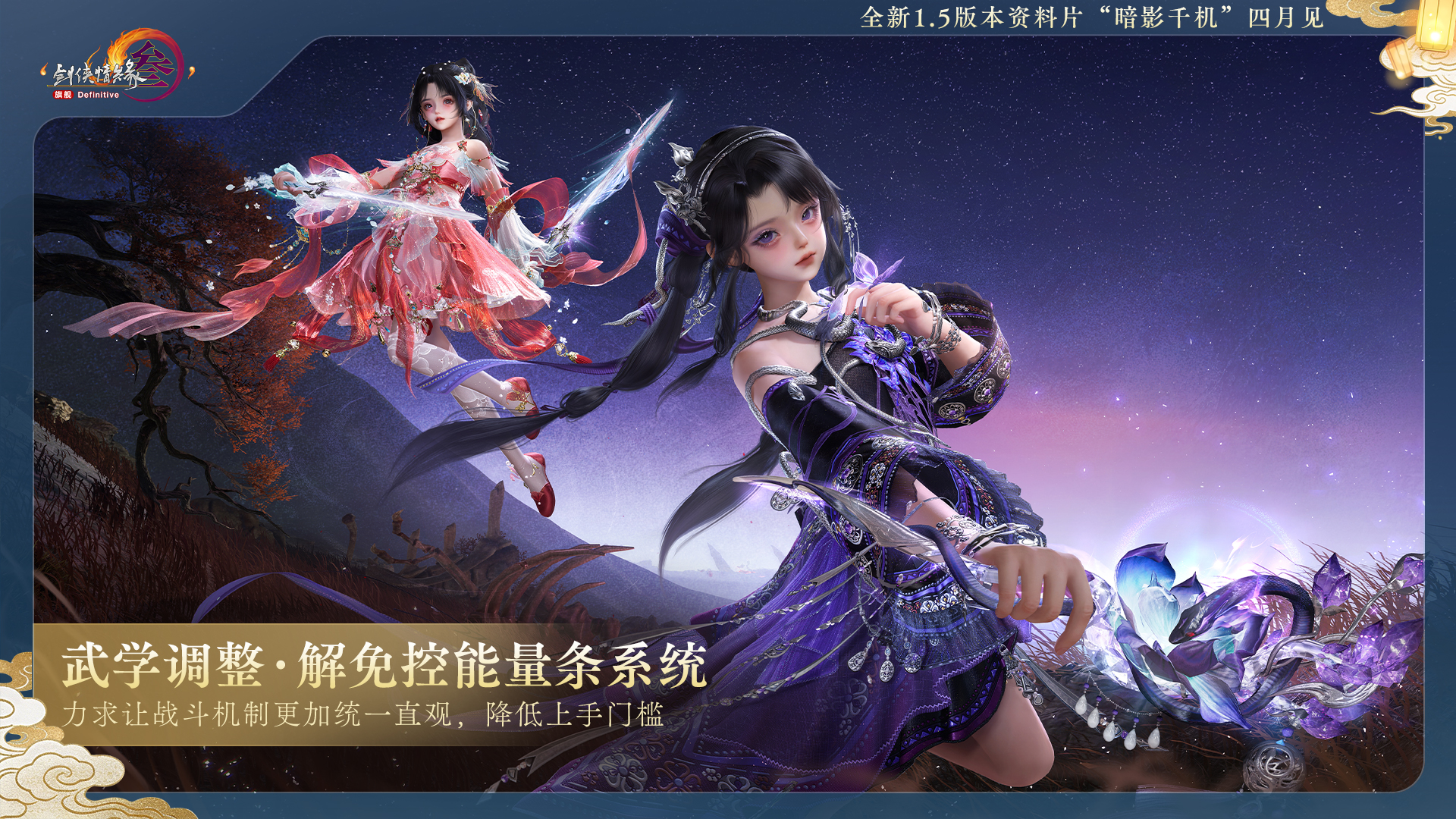 正剧动画的剧本和《谢云流传》预研项目的沉浸体验携手进入客户端,《剑网3》新资料片“暗影千机”精彩内容今日抢先看!还有经典IP重磅联动与表现技术升级开启全新篇章,不容错过! 一、 新资料片 全新1.5版本资料片“暗影千机”将于4月与大家见面!雕琢角色风格,打磨江湖细节,倾力构筑有血有肉的大唐世界! 1. 剑网3前传企划——唐简剧情体验本 在新赛季中,我们继续秉承将角色塑造视为游戏创作灵魂的这一理念,率先以一代大侠唐简为起点,与侠士们一同梦回盛唐,亲历那段流传百世的江湖往事,见证那些被后世传颂的动人故事。 其中,由于《剑网3》前传吸取了《谢云流传》的单机开发经验,因此在设计上主要以单人沉浸式体验为核心,在得以突破多人同屏所带来的效率限制的同时,有更多精力投入于内容的精雕细琢。希望通过这样的尝试,让这个江湖更加有血有肉,也让每一位角色的故事能够被更多侠士记住与体验。 2. 真实昼夜系统 在推进前传企划内容打磨的同时,我们也在持续提升游戏的整体画质表现。新赛季中,我们将从四大主城开始,逐步拓展更多场景对旗舰版探索画质的支持,并同步升级地图资源,实现昼夜循环等更丰富的视觉体验。 其中,真实昼夜系统将从4月开始更新至主城场景,并快速推进至全主城全门派更新。 《剑网3》早在十余年前就推出过昼夜系统,本次真实昼夜采用全新技术研发,以伊丽川昼夜为模板。相比常见的模拟昼夜系统,真实昼夜系统采用真实的经纬度和星轨数据、随机的天气云雨效果,规避了千篇一律的问题,力求让侠士每时每刻在每个地图都能体验到不一样的沉浸感受。 届时,所有画质资源将统一整合为旗舰版画质,方便侠士们理解和取用。然而画质的整合并不意味着对设备的更高门槛。我们会将旗舰画质的运行下限,拓展至最低支持GTX750Ti显卡流畅运行(此前为GTX1060)。同时,旗舰版低配下的卡顿概率,相较过去的重制版低配也会有显著降低。 3. 解免控能量条系统 基于旗舰端武学体系的底层调整,我们正在分阶段持续推进。近几个赛季以来,侠士们关于武学内容的各类反馈,我们都在密切关注和梳理。 一方面,我们将继续贯彻此前的核心理念——将全门派置于同一维度下,形成各有克制、首尾衔接的生态格局,让心法间的对局更具深度与生命力。另一方面,我们决定在下赛季新增解免控能量条【内劲】系统,并将在后续推进大规模武学调整,力求让战斗机制更加统一直观,既降低上手门槛,又增强整体的系统性与策略感。 4. 副本观战 在年前的剑网3新春会挑战本直播,引发了不少侠士的关注与兴趣。此前我们也陆续收到了许多反馈——不少侠士提到,每周副本的CD有限,尤其是在PVE入门阶段,更希望能够在游戏里通过实时观摩他人的打法来学习和提升。 因此新赛季中,我们将在游戏内新增副本直播与观战功能,方便大家在开荒或开设教学团时,更直观地观看其他侠士的战斗过程。希望通过这一功能,能够更好地促进交流与教学,让更多人感受PVE的乐趣。 除了上述内容,我们还将根据侠士们的反馈,对游戏进行诸多优化调整。例如,在新团队秘境中,我们将适当减少“一人犯错,全队坐牢”的机制,让挑战体验更加顺畅。新资料片的更多爆料将陆续公布,持续提升游戏基础体验,让玩法更加丰富有趣,期待与各位侠士共同探索更广阔的江湖。 二、 2026上半年联动前瞻 宿命轮回、掷定乾坤、逆天改命!诸多不可思议的联动精彩内容,将在上半年陆续与大家见面! 《剑网3》×《仙剑奇侠传三》 宿命沉浮,情深缘浅!《仙剑奇侠传三》今年四月正式赴约,以情为骨,以侠为魂,且看永安当伙计与唐门千金结伴而行,于江湖红尘中续写新的故事篇章! 《剑网3》×《大富翁》 侠士们请注意,大唐地产争霸赛开启!将运气与策略、社交与对抗完美融合,正版经典游戏《大富翁》联动即将与大家见面! 掷骰子,买地皮,每一步都藏着反转与惊喜,命运的点数将指引去往何处——?上一秒天降鸿运,下一秒意外频发!局势瞬息万变,在江湖开启一场紧张刺激的趣味之旅吧! 更多联动陆续揭秘 精彩不止于此,剑网3×国创顶流重磅联动确认,将于今夏为道友揭开神秘面纱。 今年联动选题根据十六周年游戏内玩家投票TOP选出,还有更多惊喜将在828揭幕! 三、 表现技术复盘和后续升级 去年一整年,我们对外观的整体表现进行了逐步升级。曾备受诟病的纸片珠子已全部升级为实体化建模,如今付费外观与非付费外观均全线应用:绳子、珠子、首饰等等全面实体化;布料有厚度有滚边;超重工刺绣多层叠加,动态柔顺飘逸又自然。 卷工艺,不仅站稳第一梯队,成为实体化比例最高的游戏,还真正实现了这些技术不分价格,全民应用! 万物互联端方面,低配PC/手机也支持更自然的动态表现。 外观设计上我们也在进行风格整合。分为三个重点系列,古风制式、古风设计、新风格探索,作为全年的重点,我们将在古风制式系列做更多的突破与尝试,在技术升级的前提下更着重于款式设计。 角色模型方面,不仅人物皮肤、精度的规格拉满无代餐,去年还完成了全体型高精度body升级,率先引领健康阳光的肌肉线条DIY风潮。下一步将推出全新【动态肌肉】系统,重点关注关节运动的效果,让手肘、手腕等衔接部位的能自然表现不扭曲。 [编辑:月光下完美]